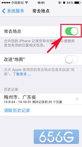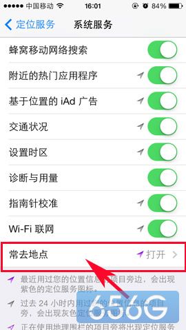 3)在【系統服務】界面就能看到【常去地點】功能了,點擊進入後對【常去地點】欄的功能按鈕進行關閉即可。(如下圖所示)