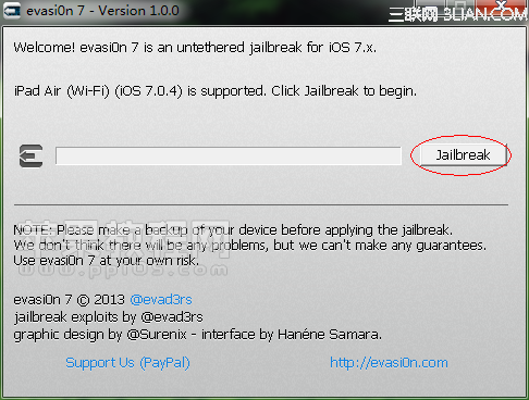 Evad3rs這一次發布的工具只針對iOS 7.x,支持所有可以安裝iOS 7的設備,包括iPad Air、Retina iPad mini、iPhone 5s和iPhone 5c。本次越獄並不支持iOS 6.1.3/6.1.4。