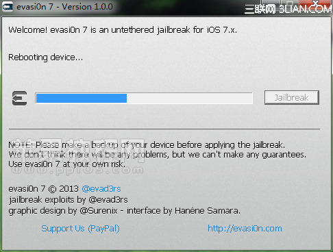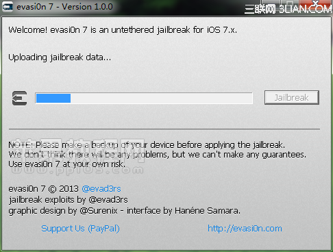 點擊打開已下載好的越獄工具evasi0n,運行evasi0n,點擊jailbreak開始越獄