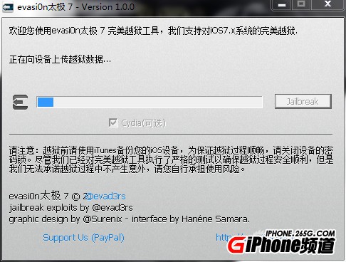 1、打開越獄工具evasi0n太極7,並點擊iOS 7設備上出現的“信任”按鈕;