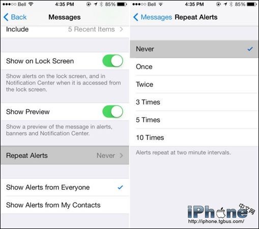 很多時候我們都沒有辦法及時的讀取手機短信,而對於蘋果設備而言有個頭疼的問題就是它默認在iOS設備設置了重復提醒(間隔為兩分鐘),這在一定的程度上是費電的,所以接下來小編來教大家iOS7通知中心信息重復如何關閉。
