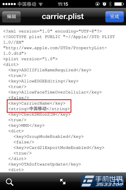 中國移動用戶:大家同樣打開iFile文件,一次打開“System/Library/Carrier Bundles/iPhone/CMCC_co.bundle”然後點擊“carier.plist”文件打開編輯。