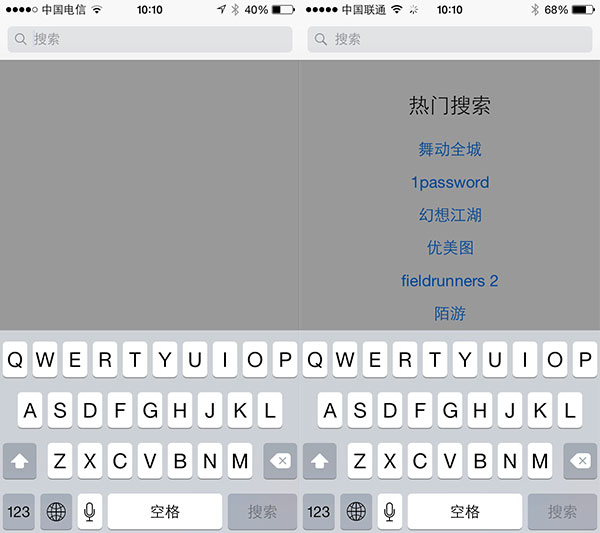 搜索界面出現了智能推薦——說白了就是關鍵字廣告。(左為iOS 7,右為iOS 8)