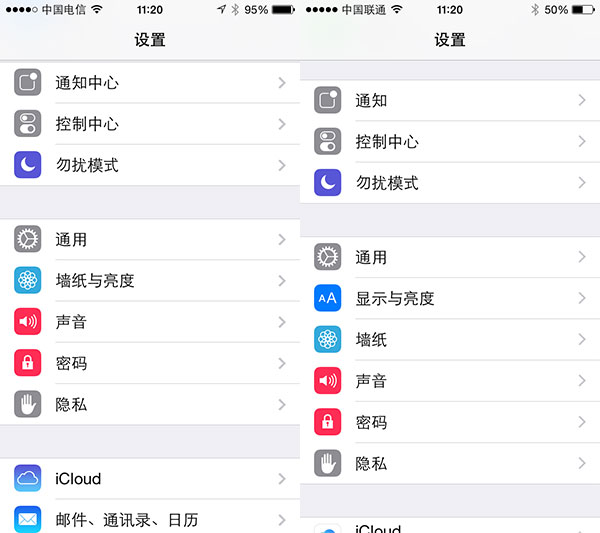 控制中心迎來了一次UI更新,略丑,可以預見會有很多處女座以及類處女座介意這個而不去升級。(左為iOS 7,右為iOS 8)