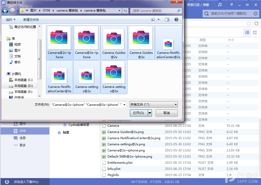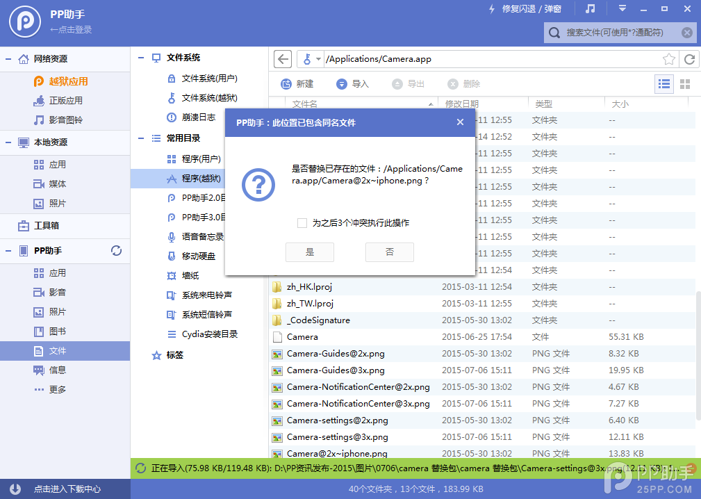 1、iOS8.4越獄後打開PP助手電腦版,連接設備,在【文件系統(越獄)】中打開路徑/Applications/Camera.app