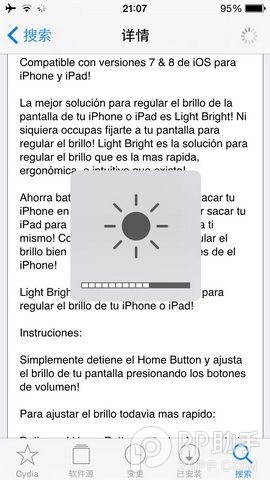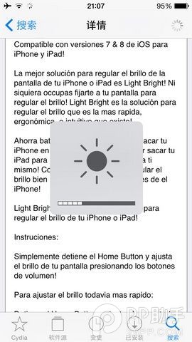 手機屏幕亮度直接對於用戶的使用體驗有著巨大的影響,於是許多手機廠商紛紛在自家手機當中加入了自動調節亮度的功能,根據周圍環境的亮度等因素自動對於手機屏幕亮度進行調節,而無須用戶手動調節,不過在iPhone當中用戶如果想要調整屏幕亮度最快捷的方法應該就是通過控制中心了。今天小編就帶來一款插件使得這個操作更加簡單,那就是《Light Bright iOS 7 & 8》。