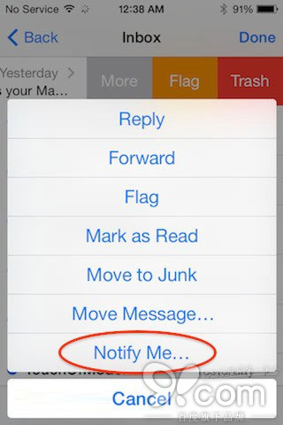 想要開啟特定郵件對話通知,只需在郵件上向左劃動,點擊更多按鈕,然後點按 Notify Me(通知我)即可。設定完成後,當特定的郵件對話有回復時,我們就可以收到推送提醒通知了。此外,我們還可以在郵件的左側看到鈴铛小圖標。