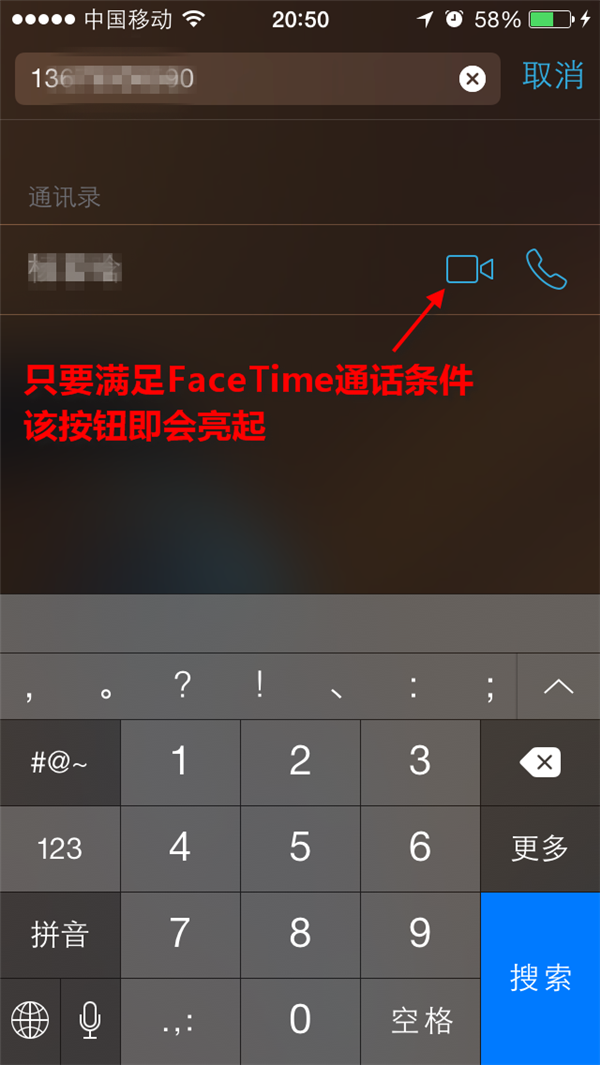進入FaceTime操作界面後,可以從手機通訊錄調出聯系人,也可自行輸入電話號碼來呼叫對方。如果對方滿足FaceTime的條件,那麼視頻通話的按鈕即會亮起,點擊即可撥通電話。