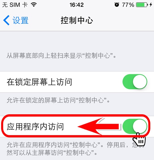 但如果擔心在游戲當中可能會錯誤的開啟了通知中心的話,可以在應用內屏蔽該功能。在“設置”下進入“控制中心”,然後將原來“應用程序內訪問”右方的滑塊向左拖動關閉即可。