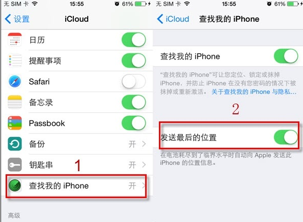 步驟2: 點擊“查找我的iPhone”一項進入,再開啟“發送最後的位置”一項。
