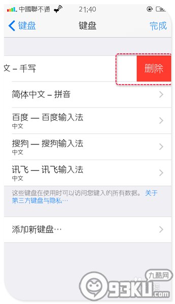 8、將你需要的第三方輸入法添加完成,並且都打開“允許完全訪問”後繼續進行下一步操作——刪除系統自帶輸入法。如圖,在系統自帶輸入法項上左滑,點擊“刪除”。
