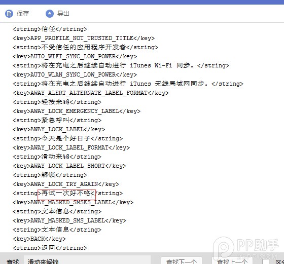 3、找到spingboard.strings ,雙擊編輯,使用查找找到移動滑塊解鎖,找到後替換成立喜歡的文字