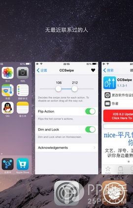 在日常使用當中如果用戶需要調用多任務管理或者鎖屏,一般來說就是通過實體的HOME鍵或者電源鍵來實現,久而久之就會對實體鍵造成損傷,於是許多插件作者以此為重點制作了多款手勢操作的插件幫助用戶解決此類問題。《CCSwipe》就是這樣的一款便捷的插件。