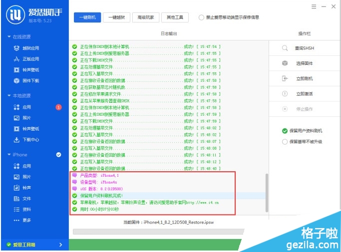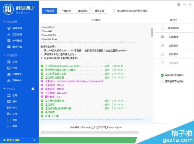 2、下載好固件之後,點擊左下角“愛思工具箱”裡的“一鍵刷機”,之後點擊右側“選擇固件”,選擇剛才下載好的固件;刷機時勾選“保留用戶資料刷機”,刷機完成後手機資料不丟失。