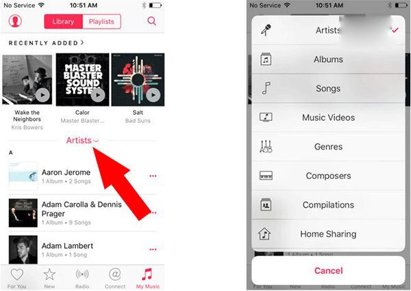 3、最後,用戶可以打開iOS設備上的“音樂”應用,選擇“我的音樂”,在顯示“藝術家”欄目的地方呼出菜單,“家庭共享”功能就在這裡。