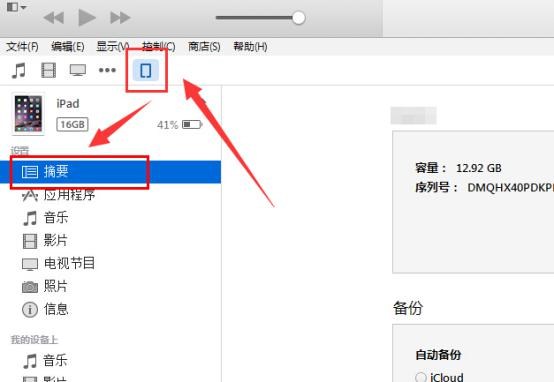 1.將蘋果手機用數據線和電腦連接起來,在電腦上打開iTunes軟件,軟件成功識別設備後,請點擊選擇手機圖標,然後進入“摘要”界面。
