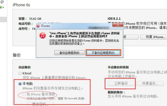 2.在備份區域,選擇“本電腦”,請不要勾選下面的備份加密選項,然後點擊“立即備份”,軟件將會彈出對話框,請這裡對話框中選擇“不備份應用程序”。