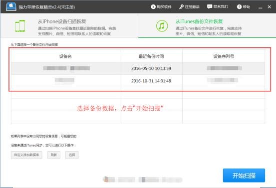 5.我們可以看見iTunes備份文件恢復界面中的軟件檢測到的備份設備,請選中該設備(如果有多個設備,請選擇想要恢復手機短信的那一個),然後點擊“開始掃描”。