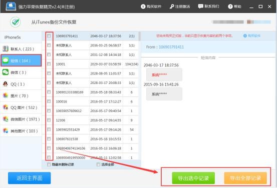 6.靜待掃描結束,在左側選擇“短信”,即可查看手機短信內容,點擊“導出全部記錄”將手機短信備份到電腦上即可;也可以勾選想要備份的手機短信,點擊“導出選中記錄”,把備份的蘋果手機短信導出來。