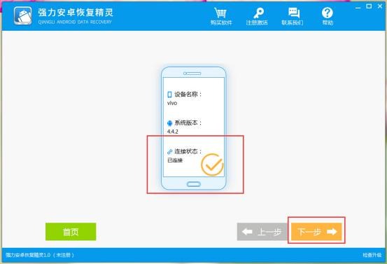 2.打開強力安卓恢復精靈(安卓恢復精靈),點擊“開始連接”,軟件成功連接手機設備後,選擇設備,單擊“下一步”。