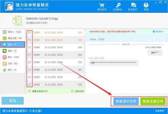 4.靜待軟件掃描結束,左側選擇“短信”,查看相對應的手機短信內容,點擊“恢復全部文件”即可將手機短信全部備份到電腦上;也可以勾選想要備份的手機短信,點擊“恢復選中文件”,導出指定備份安卓手機短信。