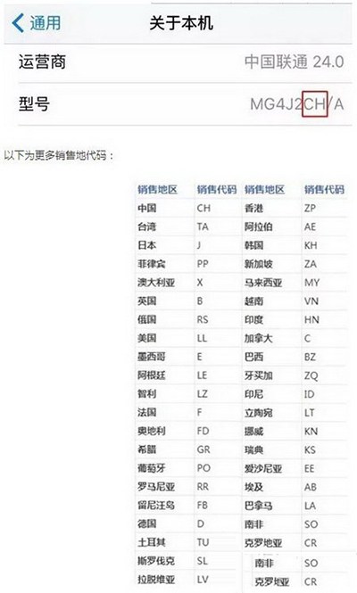 通過【設置】→【通用】→【關於本機】,獲取手機型號。最後斜槓前面兩位,其中CH是中國大陸行貨,ZP是香港版,LL是美版,J是日版……以下為更多銷售地代碼: