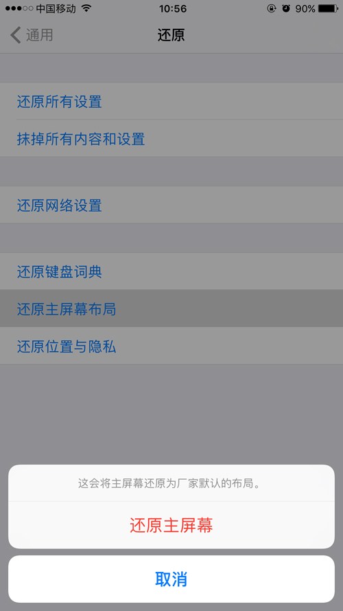 在【設置】中,找到【通用】點擊進入,找到【還原】點擊進入,點擊【還原主屏幕布局】,再點擊【還原主屏幕】即可.