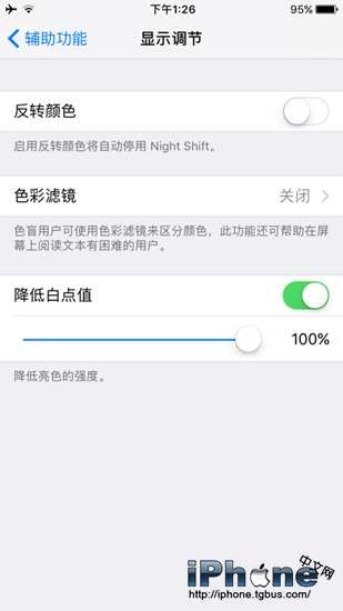 原因清楚了解決起來就很簡單了,只需要依次找到“設置——通用——輔助功能——顯示調節”,然後將“降低白點值”選項關閉即可恢復正常亮度。當然,你也可以通過改變下方的百分比數值,手動限制屏幕最高亮度所能達到的情況。