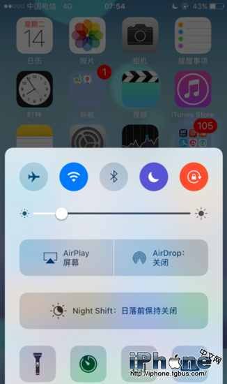 4、上拉控制中心:改變整體風格,上方的快捷鍵點亮的時候增加了不同的顏色顯示,改變護眼模式按鈕為長條!第一頁取消了音樂控制,移到控制中心第2頁(並不能自定義快捷鍵)。