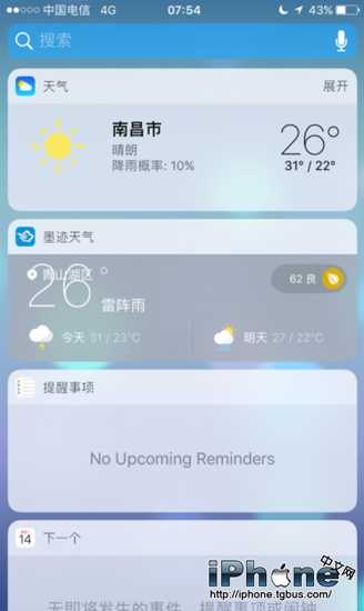 5、搜索界面:由原來的SIRI建議增加了通知中心的今天頁面,下拉的話直接進入siri建議。