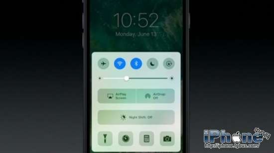 在iOS10中,屏幕下方的控制欄有了一個全新的外觀。下方原先的五個應用快捷鍵改為了四個,被刪掉的NightShift功能快捷鍵改到了上方更顯眼的位置,替換了原先AirDrop的位置。