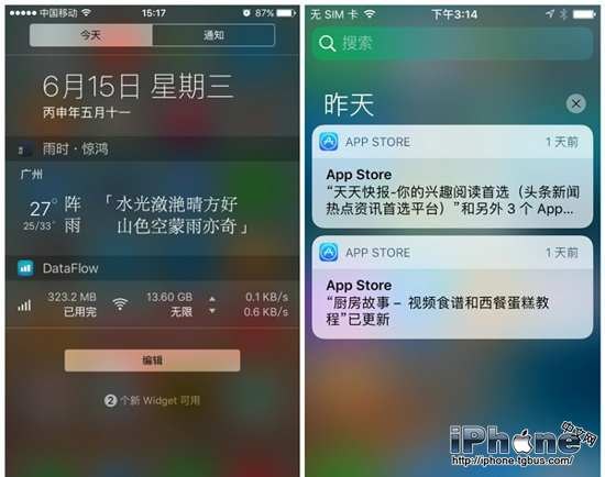 iOS10在Spolight界面集成了原本位於通知中心的Widget小部件,即【天氣、日歷、常用App、提醒事項、股市】等快捷方式,用戶可以自由編輯添加或取消,而通知中心則顯得“干淨”了許多,不僅沒有了小部件,還取消了【今天】選項,不過Spolight同時也出現在了通知中心中,方便用戶快速搜索設備中的應用。