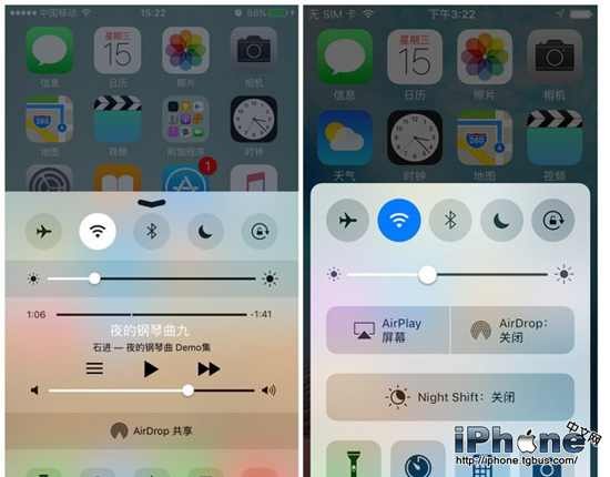 iOS10控制中心界面不再像iOS9及以前的系統一樣鋪滿屏幕,而是變成了卡片式居於屏幕下半部分,功能上除了增加【AirPlay屏幕】之外,其他的並沒有改變,只是變換了位置,將Night Shift由此前的並列在手電筒、計算器、照相等功能上變成了一個獨立的功能選項,置於控制中心的倒數第二行,而音樂播放功能則被單獨為一個界面,左滑控制中心可看到。