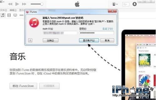 如果 iTunes 再要求輸入 Apple ID 密碼的話,請輸入後並點擊“顯示帳戶”按鈕。