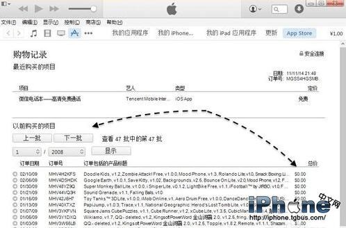 接著就會看到我們在蘋果手機上購買的所有記錄了,可以選擇不同的年份或月份來查看。在下圖中看到的,價格顯示為0的說明是免費應用軟件。