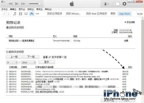 在下圖中顯示我在14年5月份有二次購買記錄,可以看到日期、訂單號、應用軟件的名字,以及具體的費用。