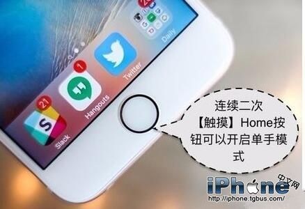 1.如下圖所示,當我們用手指連續二次觸摸【主屏Home】按鈕時,便可以觸發系統的單手操作模式。值得注意的是二次觸摸 ,而並不是按下Home按鈕。