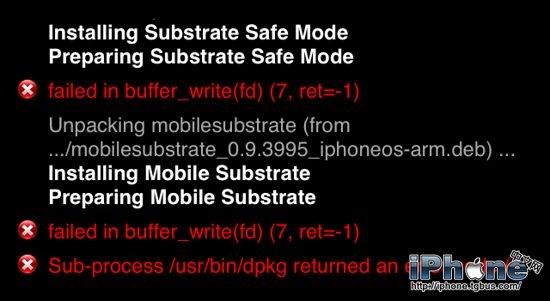 使用Cydia安裝插件時經常遇到紅色的錯誤代碼該怎麼辦呢?今天我們就來說說一個常見的紅色代碼【failed in buffer_write(fd)(7,ret=-1)】。出現這個代碼的原因是因為系統內存用完了,需要清理系統內存才行。