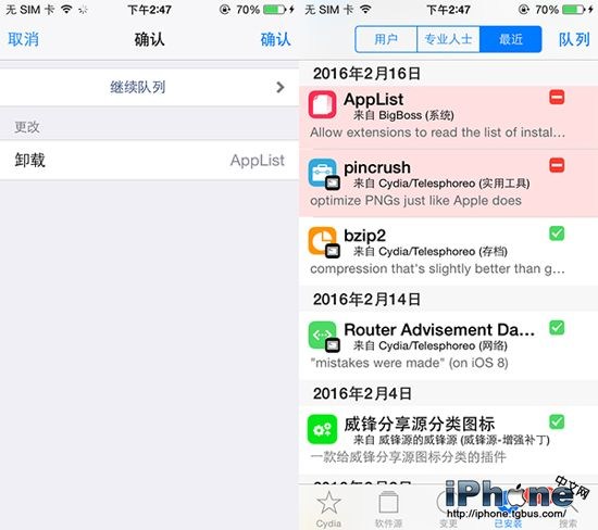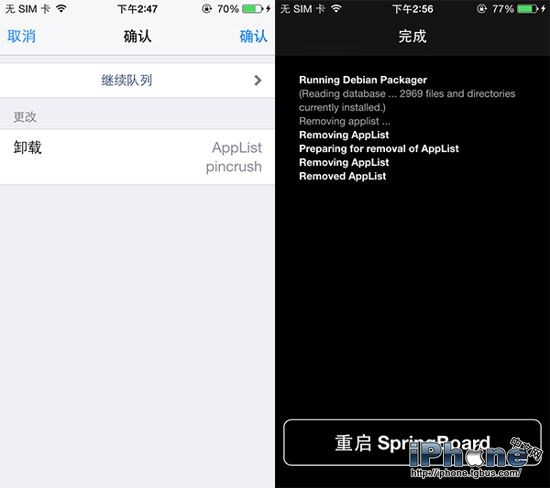5、卸載完成後,設備將要求你進行重啟或者注銷。同樣的,使用繼續隊列這個方法也可以進行Cydia插件的批量安裝。