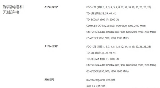 從蘋果官網公布的數據來看,國行iPhone SE分為A1723和A1724兩個版本,前者為全網通,支持移動聯通電信的2G/3G/4G網絡,後者是雙網通,支持移動聯通的2G/3G/4G網絡。