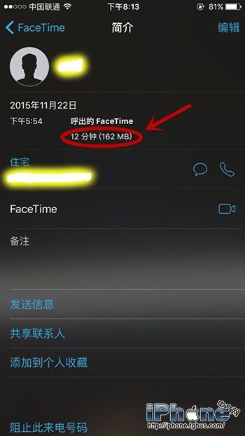 首先打開FaceTimeApp,然後點擊姓名右側的信息按鍵,在通話信息板塊的頂部,你會發現進行了FaceTime的通話時間,而且,在這裡我們將可以看到你這次通話所使用的流量。