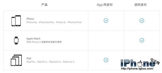 線下支付支持的機型有:iPhone 6s、iPhone 6s Plus、iPhone 6、iPhone 6 Plus和Apple Watch;