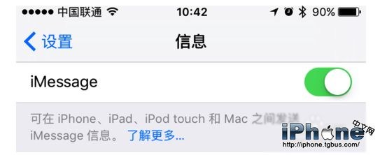 4、當然要發送藍色背景的信息時,是需要具備有一定的條件才可以。首先自己必須是使用蘋果 iPhone 手機,並且在【設置-信息】裡打開了 iMessage 功能服務。如下圖所示,只要當前你所使用的是 iPhone 手機,便可以自己打開這個功能。