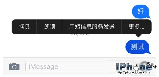 8、此外在發送 iMessage 信息時,也可以通過長按正在發送的信息,選擇【用短信息服務發送】選項來切換。