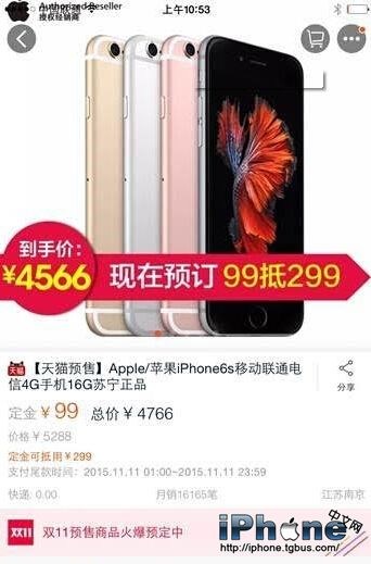天貓宣布,繼續以全網最低價預售iPhone6S,用戶只需提前支付99元定金,雙11當天即可以4766元的總價購買16GB版國行iPhone6S。而在雙11當天,99元定金是可以抵扣299元的,等於說iPhone6S的到手價只有4566元。這個價格幾乎已經接近港版iPhone6s原價了,還能再低麼!趕緊買買買!