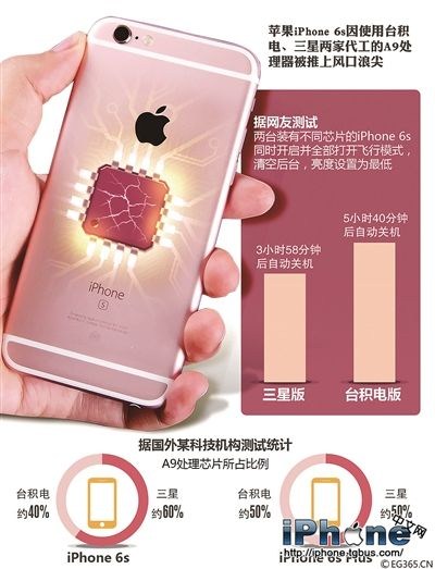 據悉台灣版的蘋果iPhone 6s采用的處理器有台積電與三星兩種,而三星處理器的效能和電池續航力比台積電的要弱。同樣的價格買來的手機,電池續航力卻不一樣,不少粉絲怒火中燒。更有網友測試稱三星版比台積電電池續航力少2個小時。原本電量就不夠用的蘋果手機再被克扣了2個小時續航力。台灣用戶高呼要退貨。但蘋果官方和科技網站 Ars Technica認為兩個版本芯片差異僅2到3個百分點,沒有網友形容那麼誇張。