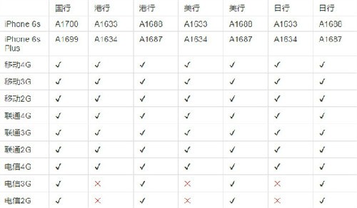 iPhone 6S不同版本的支持網絡制式: