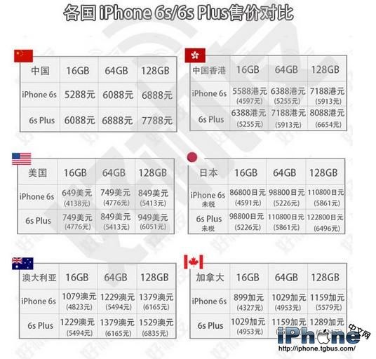 首先小編給大家帶來iPhone6s各國售價對比: