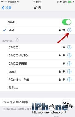 點擊已連接的WIFI網絡後面的“感歎號”,進入網絡設置界面。