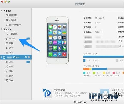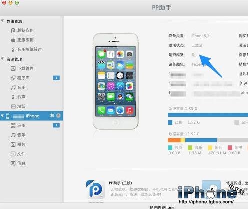 這裡我們以PP助手為例,先把 iPhone 用原裝數據線連接,打開 PP 助手,點擊左側的 iPhone 一欄,會在右窗格中看到機器的相關信息,可以看到是否越獄一欄顯示“是”,如圖所示